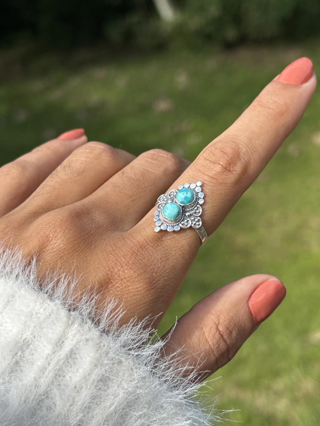 Este anel em prata 925 traz duas pedras turquesas naturais em formato oval, envolta por delicados detalhes boho que enriquecem a peça com um toque artesanal e cheio de personalidade.