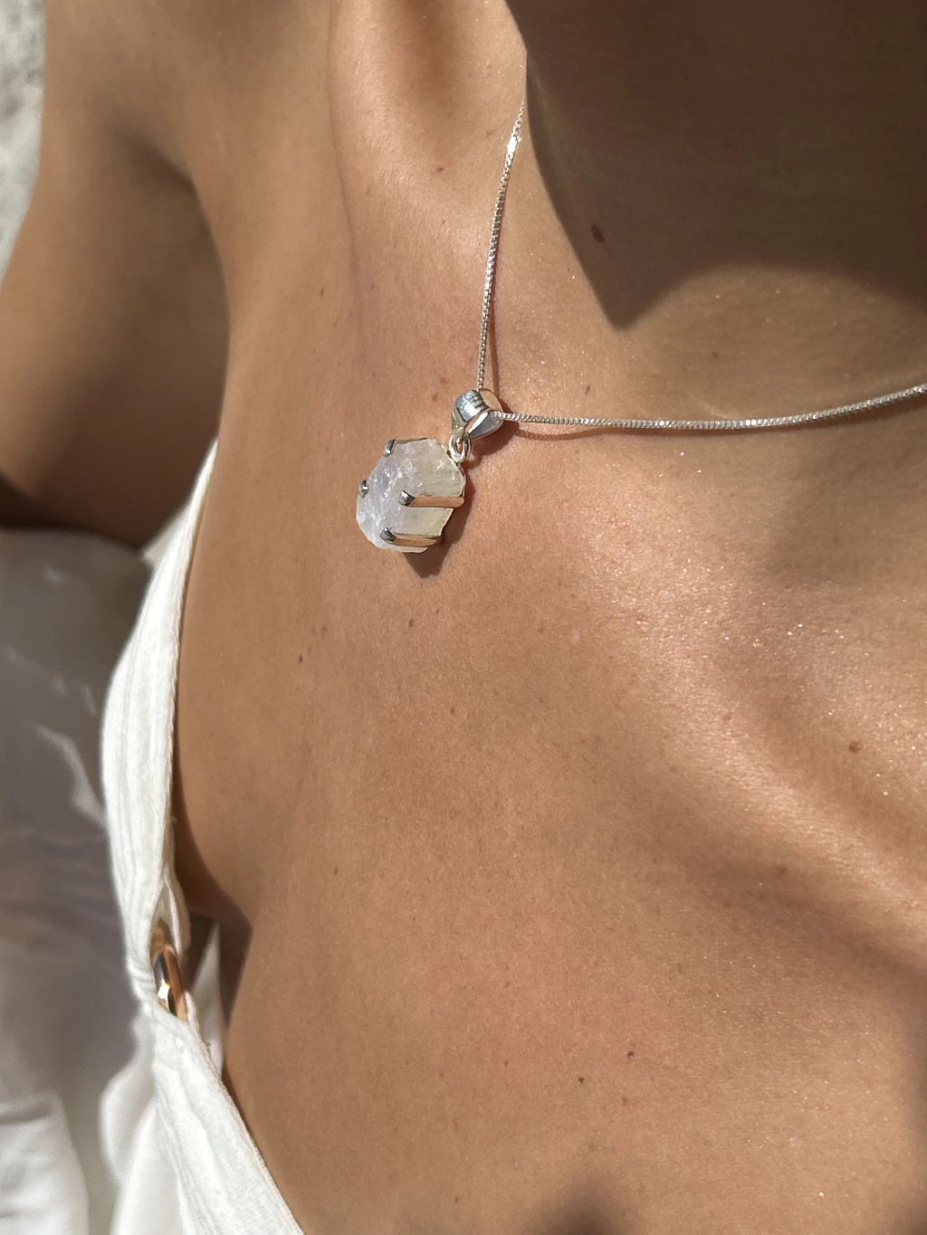 Nosso pingente apresenta uma pedra da lua belíssima, em seu estado natural, capturando a essência pura e encantadora desta gema celestial.